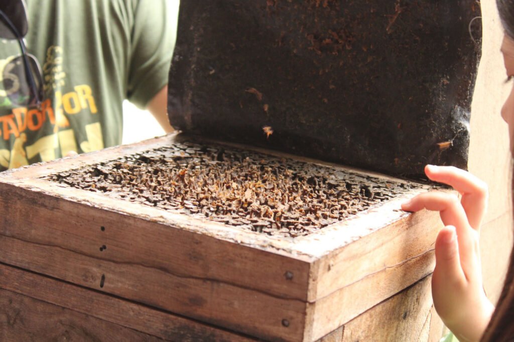 As abelhas, todas nativas e sem ferrão, como das espécies Jataí, Mandaçaia e Mirim, fazem parte da paisagem da escola em colmeias feitas de madeira e material reciclável. A cada semana, grupos de estudantes alimentam os enxames com xarope e proteína natural e observam a atividade das operárias. Os espaços também viraram abrigo de pesquisas, desenhos e redações sobre ecologia.