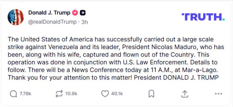 “Os Estados Unidos da América realizaram com sucesso um ataque em grande escala contra a Venezuela e o seu líder, o presidente Nicolás Maduro, que foi, juntamente com a sua esposa, capturado e levado para fora o país”, escreveu Trump na rede social Truth Social.