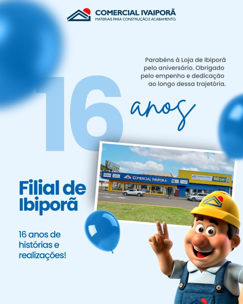 A Comercial Ivaiporã comemora 16 anos de atuação em Ibiporã, consolidando-se como uma das principais referências da cidade quando o assunto é materiais e produtos para construção. Ao longo desses 20 anos, a empresa construiu uma relação de confiança com clientes e profissionais da área, oferecendo soluções completas para obras de pequeno, médio e grande porte.