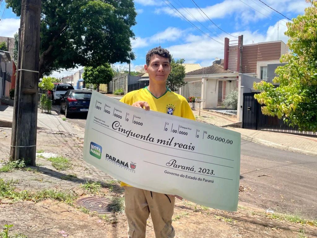 O cambeense Marcelo Ferreira Leme, de 22 anos, recebeu simbolicamente o cheque de R$ 50 mil após ser um dos premiados no sorteio mensal do Nota Paraná.