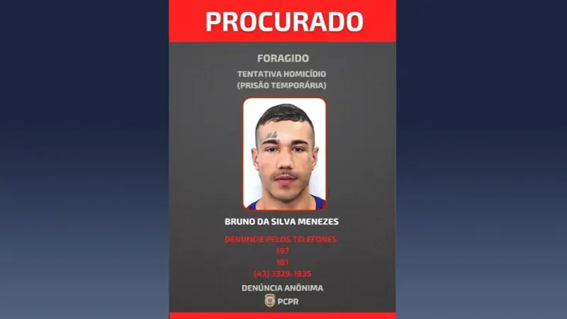 A Polícia Civil do Paraná (PCPR) divulgou nesta quinta-feira (23) a foto de um homem, de 28 anos, foragido pelo crime de tentativa de homicídio em Londrina, no Norte do Estado.