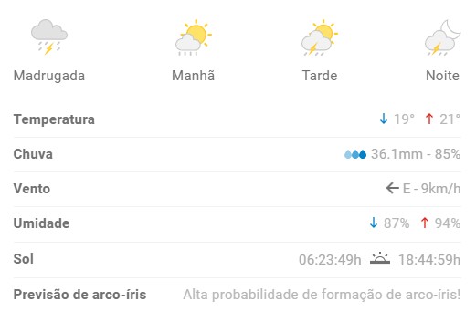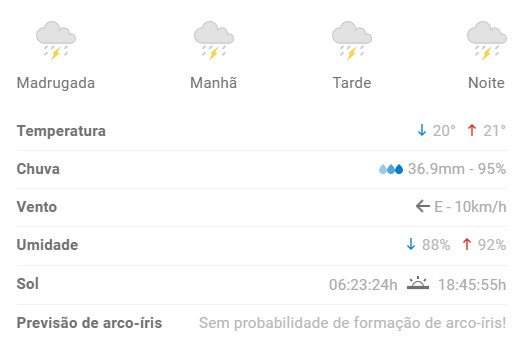 Hoje será mais frio que ontem: Tempo severo, com chuva forte e trovoada de manhã, à tarde e à noite.