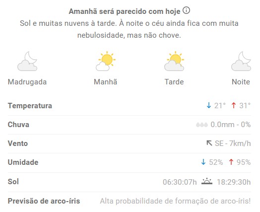 Amanhã será parecido com hoje: Sol e muitas nuvens à tarde. À noite o céu ainda fica com muita nebulosidade, mas não chove.